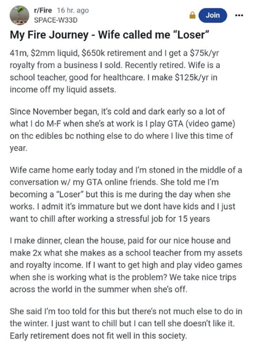 This Reddit post shows the oversights that FIRE movement members make when they choose to pursue the lifestyle. By all accounts, the original poster here is a FIRE success story–a smashing success, even. Still, his spouse is clearly unhappy with how he is spending his early retirement. Setting aside the value of how he is occupying his time, if the original poster’s ultimate retirement goal is to spend his time taking drugs and playing Grand Theft Auto nonstop, then I see no reason why he could not have done that from the start. Why go through the hassle of saving millions of dollars and sacrificing for years?